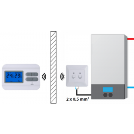 Термостат KG Elektronik C3 RF состоит из двух блоков. Один переносной блок управления (термостат), а второй приемник управления котлом. Благодаря беспроводной радиопередаче, соединение между термостатом и котлом не требует использование электрического провода. Частота компонентов фабрично синхронизирована. Собственный код защиты обеспечивает бесперебойное обслуживание.