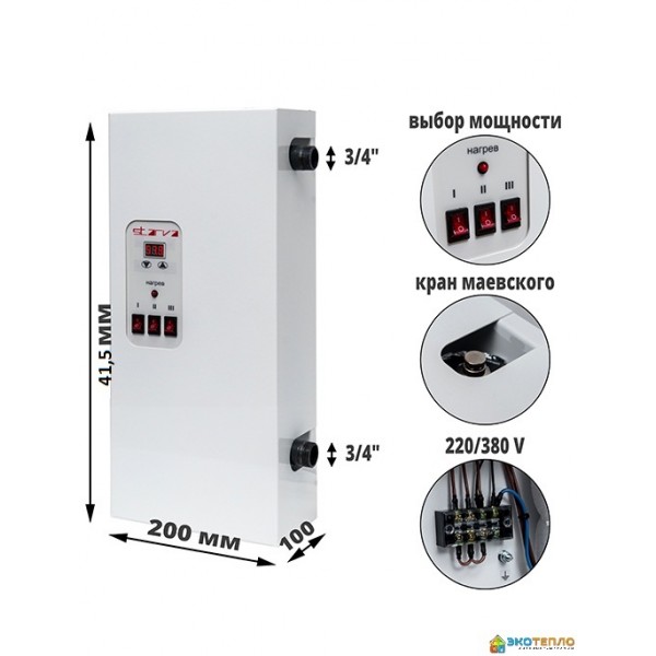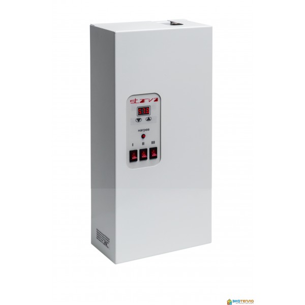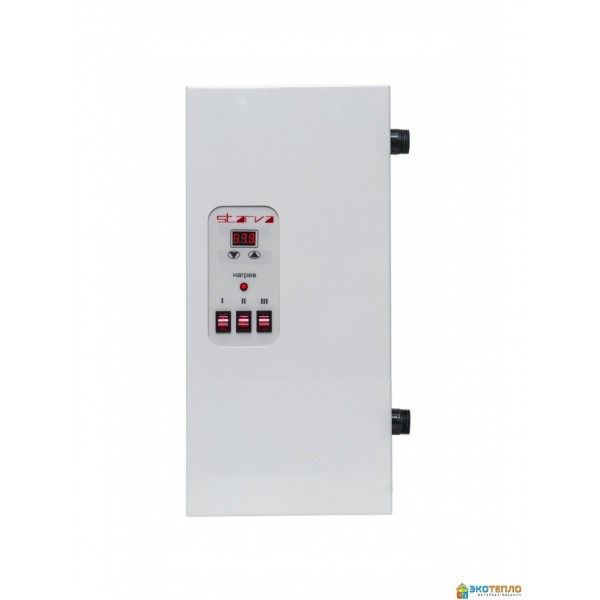 Электрический котел STARVA 045. 4.5 кВт 220\380 В с цифровым управлением и выбором мощности (2.0, 4.0, 6.0 кВт) . Новейшая модель 2020 года, в ней учтены и исправлены все недоработки прежних поколений электрических котлов. ТЭНы изготовлены из кислотостойкой нержавеющей стали, в качестве изолятора применен переклас, а нагревательный элемент - фехраль, установлены практически бесшумные реле, выключатели выбора мощности подключены к реле, а не к ТЭНу, что исключает их выход из строя, установлена аварийная звуковая сигнализация. Все комплектующие украинского производства и имеют гарантию 2 года.