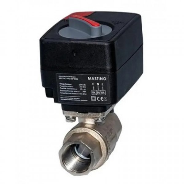 - 3. Кран с электроприводом Mastino 220В 3/4" Кран с электроприводом предназначен для открытия/закрытия подачи воды под управлением контроллера в системах водоснабжения и отопления. Функции: - контроль протекания воды. - автоматическая блокировка водоснабжения при срабатывании любого датчика. - звуковая и световая сигнализация об аварии - защита шарового крана от брожения (автоматический проворот крана дважды в месяц)