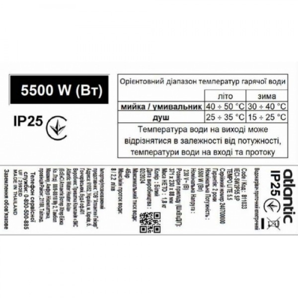 ATLANTIC TEMPO LITE IECI-SW2P55 SP 5.5 KW – компактный и практичный проточный электрический водонагреватель, станет надежным помощником в обеспечении горячей водой. Мощный медный ТЭН в 5.5 кВт гарантирует нагрев до желаемой температуры, а удобная система регулировки позволит легко ее установить. Для удобства эксплуатации в комплект поставки включена душевая лейка с 5-ю режимами работы.