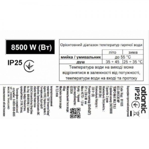 Гарантия на проточный водонагреватель Atlantic Tempo Max Multi IECI-SW2C85 MP 8.5 KW, предоставленная производителем, составляет 2 года.